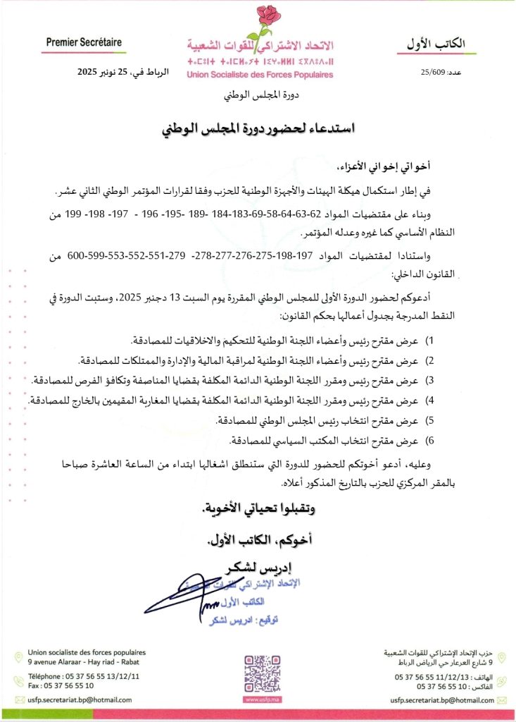 أدعوكم لحضور الدورة الأولى للمجلس الوطني المقررة يوم السبت 13 دجنبر 2025، وستبت الدورة في النقط المدرجة بجدول أعمالها بحكم القانون: