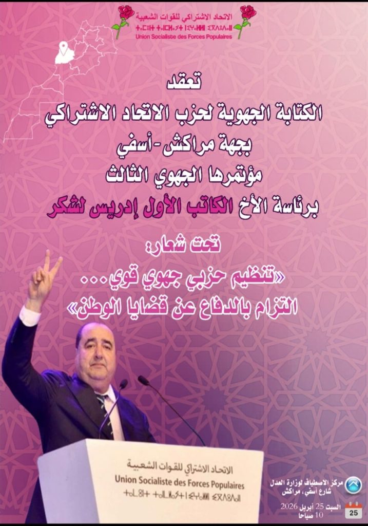 تعقد الكتابة الجهوية للحزب بجهة مراكش اسفي مؤتمرها الجهوي الثالث برئاسة الكاتب الأول الأستاذ إدريس لشكر ، تحت شعار “تنظيم حزبي جهوي قوي… التزام بالدفاع عن قضايا الوطن “، وذلك يوم السبت 25 أبريل 2026 على الساعة العاشرة صباحا.