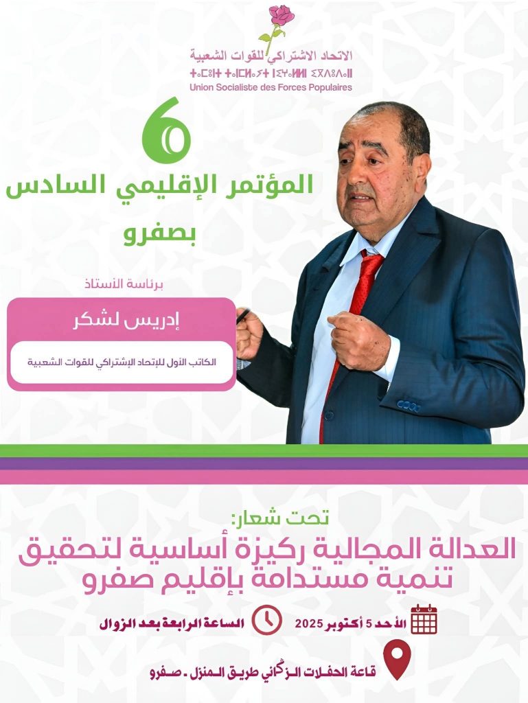 انعقاد المؤتمر الإقليمي السادس للحزب بصفرو برئاسة الكاتب الأول الاستاذ إدريس لشكر تحت شعار “العدالة المجالية ركيزة أساسية لتحقيق تنمية مستدامة بإقليم صفرو”، وذلك يوم الأحد 05 أكتوبر 2025
