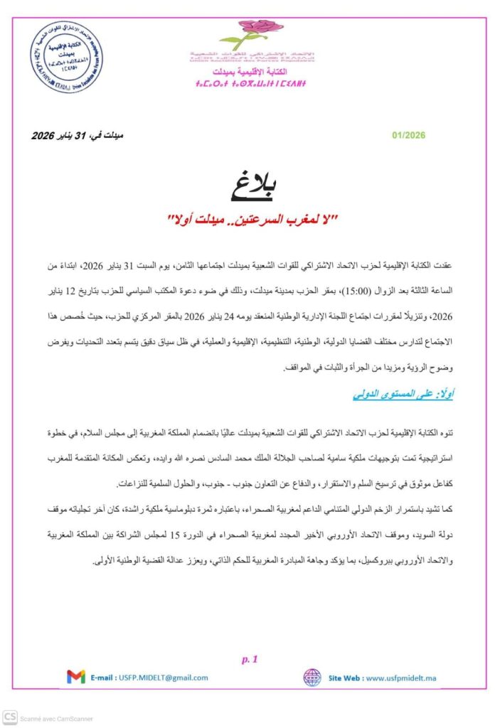 بلاغ الكتابة الإقليمية للحزب بميدلت 2 فبراير 2026 Facebook WhatsApp Twitter LinkedIn Print بلاغ الكتابة الإقليمية للحزب بميدلت تعليقات الزوار ( 0 ) مستجدات الحزب 2 فبراير 2026 بلاغ الكتابة الإقليمية للحزب بميدلت 1 فبراير 2026 برنامج عمل منظمة النساء الاتحاديات ضمن آليات صندوق دعم تشجيع تمثيلية النساء 28 يناير 2026 مداخلة النائب الحسن لشكر باسم الفريق الاشتراكي – المعارضة الاتحادية لتقديم مقترح القانون المتعلق بإحداث هيئة قضايا الدولة بلاغات وبيانات 2 فبراير 2026 بلاغ الكتابة الإقليمية للحزب بميدلت 25 يناير 2026 بلاغ اللجنة الإدارية الوطنية للحزب 8 ديسمبر 2025 بلاغ الكتابة الإقليمية للحزب بفاس مواضيع ذات صلة برنامج عمل منظمة النساء الاتحاديات ضمن آليات صندوق دعم تشجيع تمثيلية النساء مداخلة النائب الحسن لشكر باسم الفريق الاشتراكي – المعارضة الاتحادية لتقديم مقترح القانون المتعلق بإحداث هيئة قضايا الدولة الفريق الاشتراكي يقدم مقترح قانون يرمي إلى إحداث هيئة قضايا الدولة سعيد بعزيز: الحكومة تتهرب من مسؤوليتها في حماية الطفولة وتحملها لوكالة جديدة