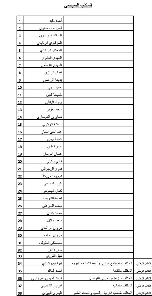 غير ان المهمة التي استعظمتها وآرقتني في هذا الامتحان الصعب، هي اقتراح اعضاء المكتب السياسي، فقد وجدتني امام ثلاثة إكراهات: إكراه توصية المؤتمر الثاني عشر بالتقليص، وإكراه الاستحقاقات الانتخابية القادمة، وإكراه ضرورة التجديد ولتشبيب والحاجة للاستمرارية. إنني كرب أسرة مكلف بالاختيار بين أبنائه، وهي مهمة لا يمكنني التهرب من القيام بها بحكم الإلزام والضرورة؛ فإنني التمس العذر من اخواتي وإخواني ممن لا يمكن المجادلة في مشروعية طموحهم، وهن وهم كثر، ولم تسعفني المساحة المسموح بها في اقتراحهم، مؤكدا للجميع أنني أفعل ذلك اضطرارا لا اختيارا، حسبي انني في اجتهادي هذا لست أروم سوى خدمة الحزب بقدر ما استطعت من الإنصاف ومن الحرص على النجاعة والفعالية.