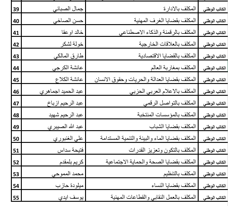 لقد أسعفتني أنظمة الحزب بخصوص النقطة الاولى المتعلقة بإضافة فعاليات للمجلس الوطني في حدود عشرة بالمائة (10%) من اعضائه المنتخبين طبقا للمادة 46 من النظام الأساسي، ورغم ان هذه النسبة لا تسعف في إنصاف مئات، إن لم أقل آلاف، الكفاءات والأطر التي يزخر بها حزبنا، فإنني سأقترح عليكم لائحة في حدود المسموح به، بأسماء أخوات وإخوة ممن اعتقد انهم يشكلون قيمة مضافة لهذه الهيئة التقريرية، اعتبارا لوزنهم ومساهماتهم الجليلة في مسار الحزب، ممن أراهن على كفاءاتهم في تطوير مقاربات وأدوات ووسائل عمل حزبنا في المجالات التي نحن في أمسّ الحاجة إليها لمواكبة التطور العلمي والتقني.